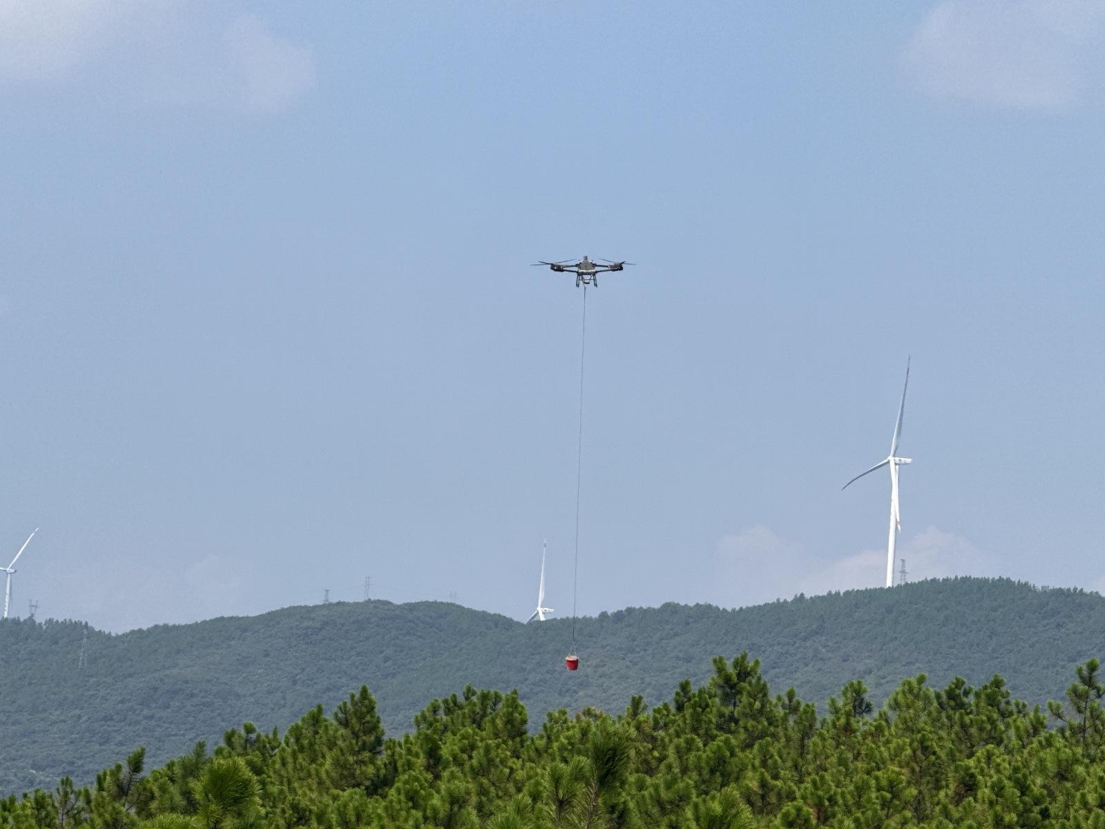 該項目位于郴州市宜章縣五嶺山脈,屬陸地風力發電工程,35kV集電線路全線需建設22基雙回路塔(直線塔10基、耐張塔12基)。復雜的地形導致傳統運輸方式效率低下、植被破壞嚴重,且鐵塔基礎分散、租地協調困難。為破解難題,項目管理團隊周密策劃,做好沿途運輸路線踏勘,查找低空領域規范和民用無人機駕駛航空器運行安全管理規則,在確保安全合規的基礎上,充分發揮自有作業力量優勢,組建無人機運輸團隊,創新實施“大型運重、中型運量”運輸策略。即大型重載無人機主攻50150KG鋼筋、塔材等大重量構件運輸,突破傳統重載瓶頸;中型無人機負責50KG以內的水泥、砂石及工器具等散件配送,2臺中型無人機編隊,實現每小時45趟次的高頻運輸,高效支撐施工全流程。經實踐檢驗,該技術預計將運輸主工序工期縮短至10天,項目整體運輸成本較預期降低20%。